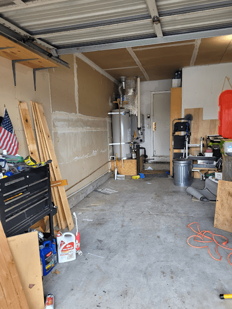 The next day we were able to remove the cabinets from the garage and let me tell you it was a process. In the end it’s so worth having them gone. I’ve had friends say that it sounds like a great idea to have that in the garage, it wasn’t, they weren’t level, the tops were just planks of wood nailed in or stapled in and turns out there was water damage on the lower portions that you don’t see until you clean them out of the tons of paint cans in them.